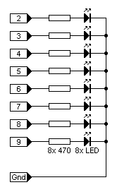 El puerto paralelo no puede suministrar ni someterse a grandes potencias de trabajo, lo quemaria literalmente y con compromisos de la Tarjeta Madre.Por lo que se proponen estas etapas de potencia y aislamiento con el fin de proteger el puerto y poder controlar dispositivos más potentes...Conectar a una de las salidas (0-9pin ) el [-] a GND: